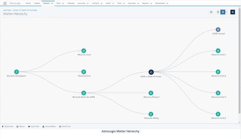 The Matter Hierarchy quickly displays a matter’s parent and child relationships to other matters in your organization. Matter relationships are a result of the assignment of a parent matter on the matter’s page layout or by creating Cross Reference Matters.