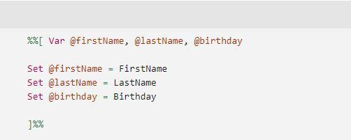 Inside the code snippet block, let’s create the container for our AMPScript by creating opening and closing brackets: %%[ the code goes here ]%%. Next, we’ll declare our variables using the Var keyword and separating each variable with a comma. We’ll use the Set command to give the variables the value of the information taken from the columns in our example data extension.