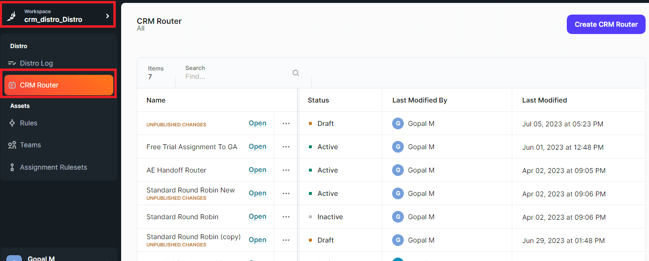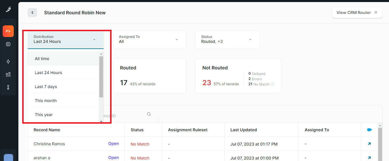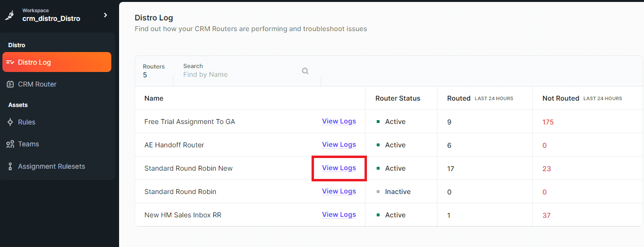 - After that, you’ll see a list of all your CRM Routers used in Distro. The list includes the total records, records routed in the last 24 hours, records not routed in the last 24 hours, and the status of each router.