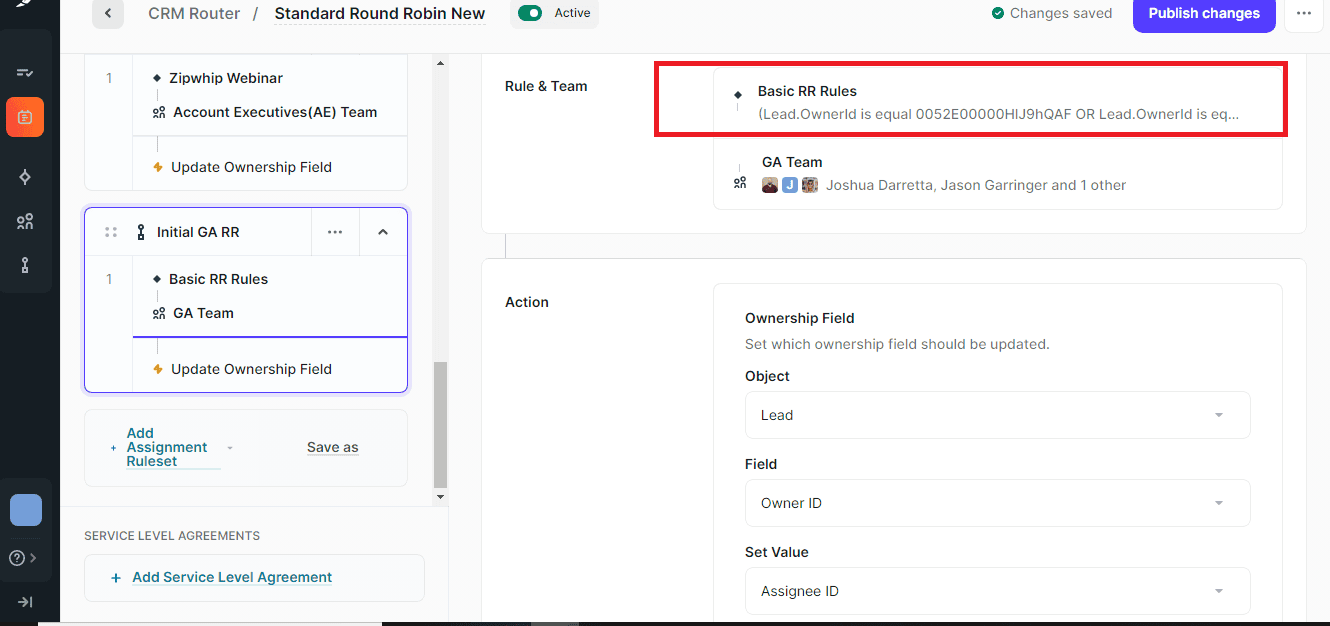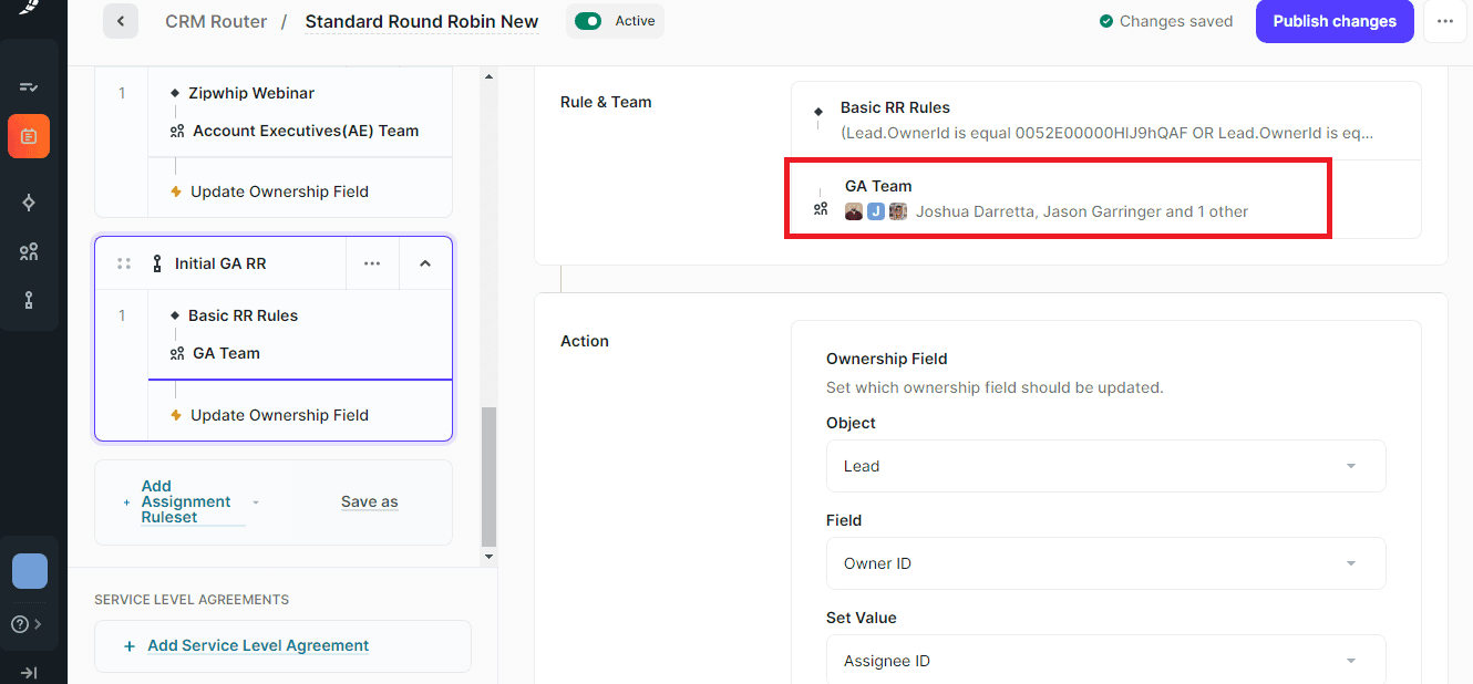 - Select the team that we created earlier in the blog’s initial stages. These teams will help assign users to specific records when the rule conditions are met