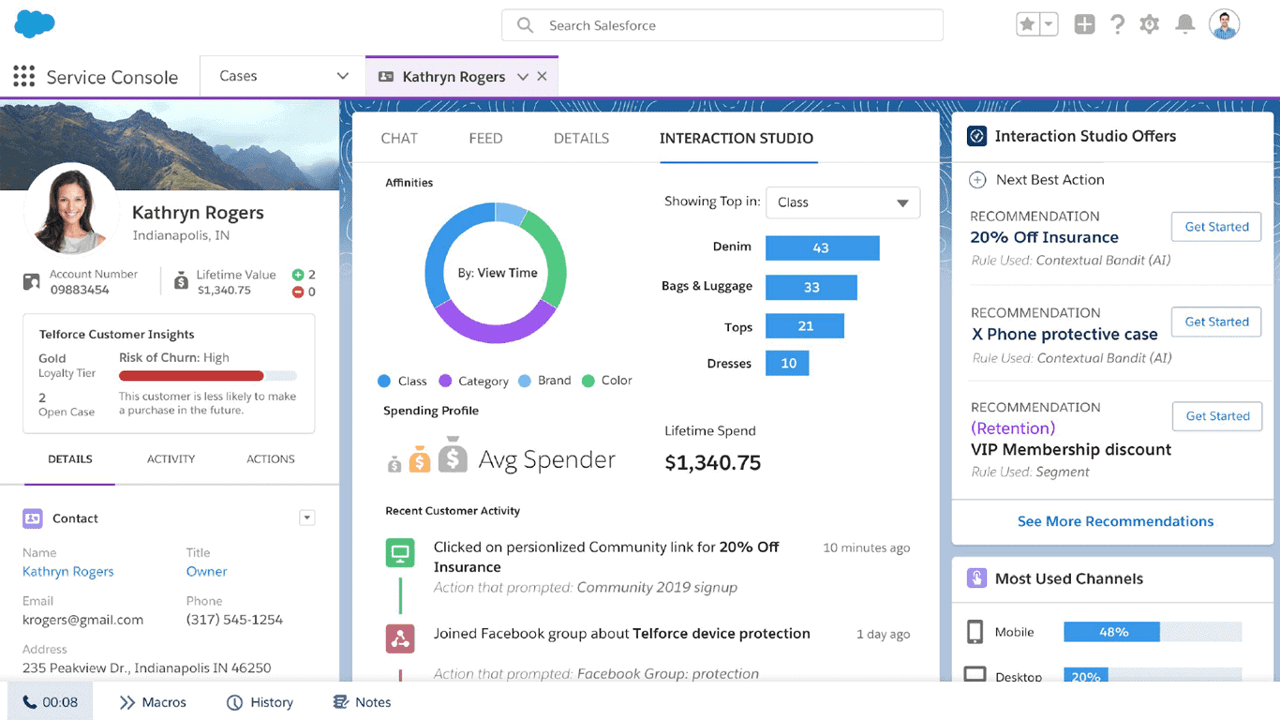 The Interaction Studio Connector for Sales and Service Cloud enables customer service agents to access a customer’s profile and recent interactions, providing personalized recommendations and enhancing the customer service experience.