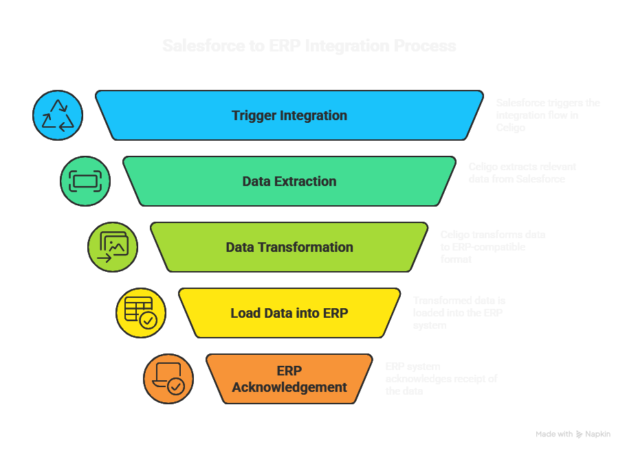 Below is a simple architecture flow for order-to-cash using Salesforce, Celigo, and an ERP: