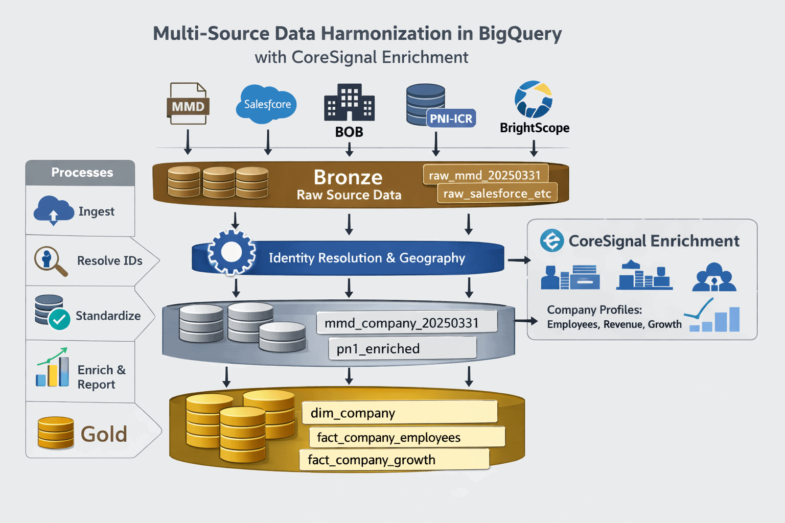 This blog walks through a proven BigQuery-based Medallion architecture approach to harmonize multi-source data across cycles (MMD, BOB, BrightScope, Salesforce, PNI, ICR). By standardizing data into layered Bronze → Silver → Gold zones and enriching company profiles at scale using CoreSignal, this pattern enables reliable analytics while addressing rate limits, data quality challenges, and future source onboarding.