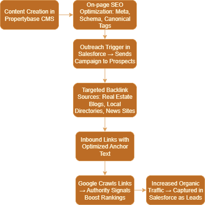 Example Setup: A Twopir client in New York created hyper-local neighborhood guides within Propertybase, each with unique Salesforce record IDs but canonical URLs pointing to SEO-friendly slugs. Outreach targeted local newspapers and community blogs, earning 25+ quality backlinks in 60 days.