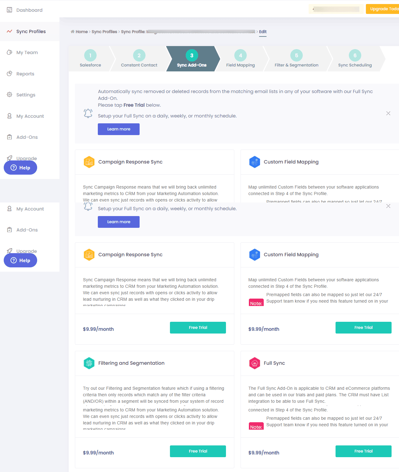 - The Add-Ons screen allows you to select those you want and more for each software you connect.