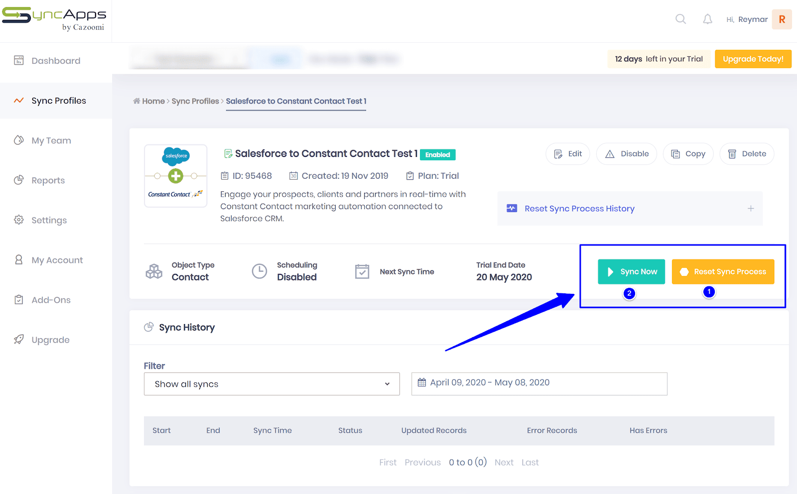 - Please note that if you’re currently/manually editing your Sync Profile, you will have to click the “Reset Sync Process” button before you click the “Sync Now” button.