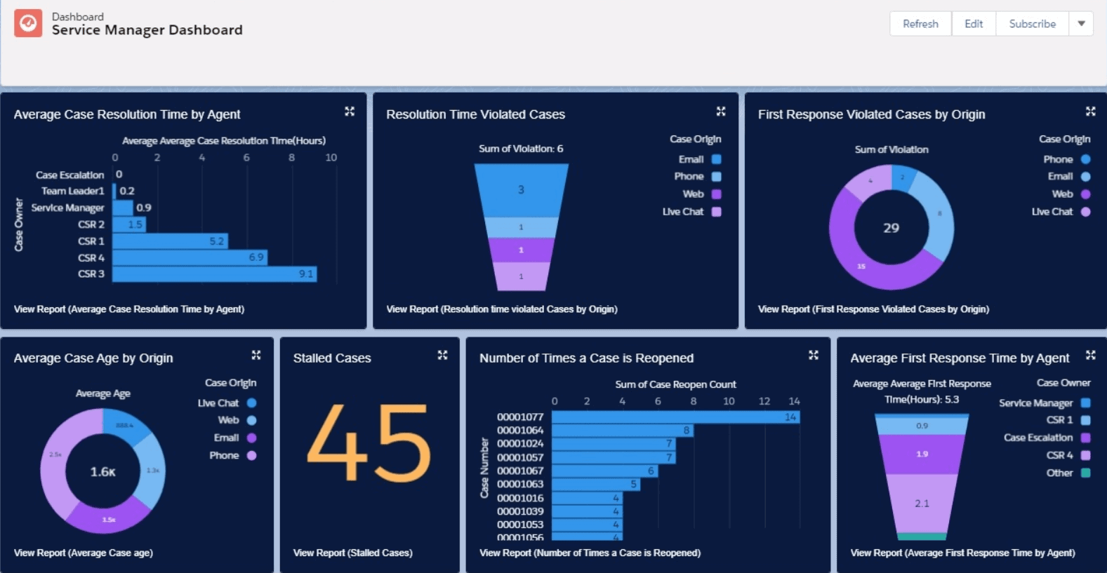 Salesforce offers standard and customizable report types to meet diverse reporting needs, ensuring comprehensive visibility into service operations.