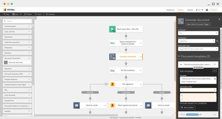 - Use connector actions to update data, move files, or generate documents in applications like Box, SharePoint, and Salesforce.