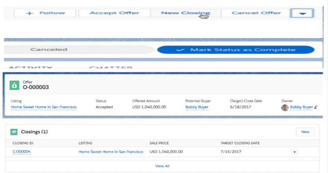 - Integration with Offers and Listings: The Closing object likely integrates with Offers and Listings objects. This ensures data like buyer and seller information, and property details automatically flow into the Closing record.