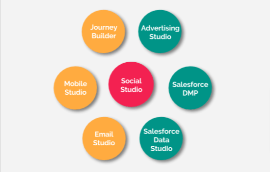 Salesforce Advertising Studio is not an isolated apparatus. Data can be imported into the Studio from Salesforce Marketing Cloud, Sales Cloud, and Service Cloud. The Studio gathers customer data from interactions on mobile devices, email campaigns, and website conversions in order to target both existing and potential customers on social platforms.