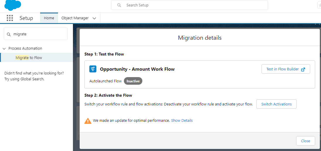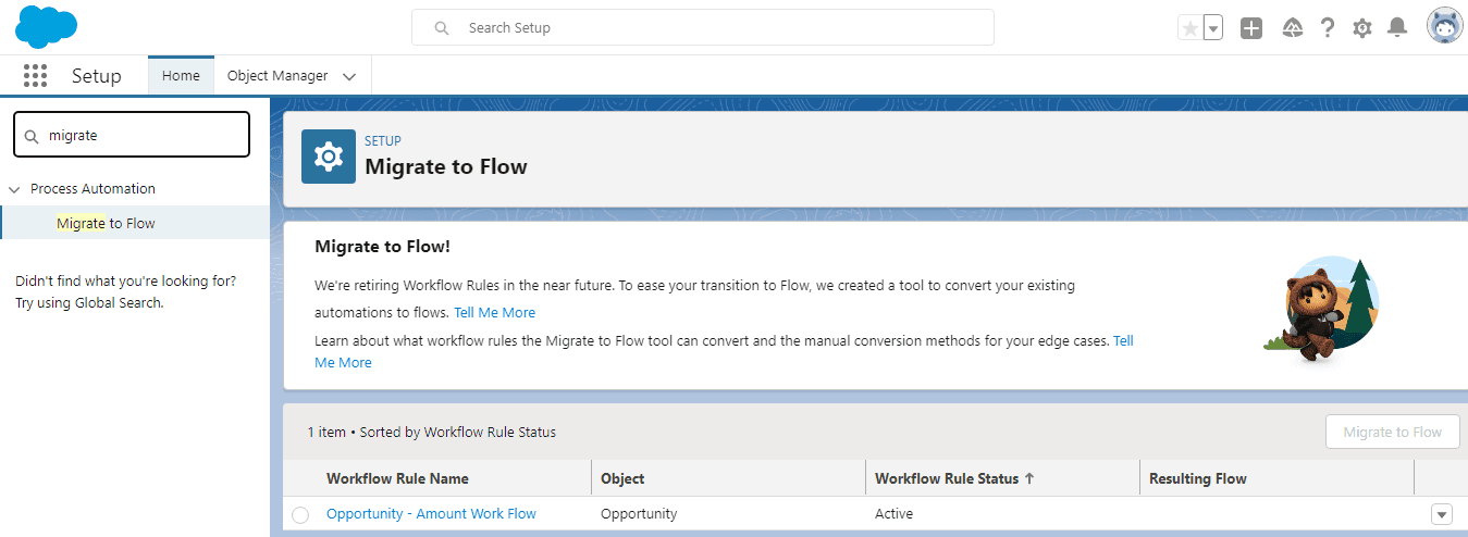 Migrate tool Available in Sandboxes and Production environments. Let’s have a look at what the tool is and how it works. To open it, navigate to the Setup menu and search for ‘Migrate to Flow (Beta)’. You will be presented with a list of Workflow Rules that can be migrated to Flows using the tool (in this example, there’s just one).