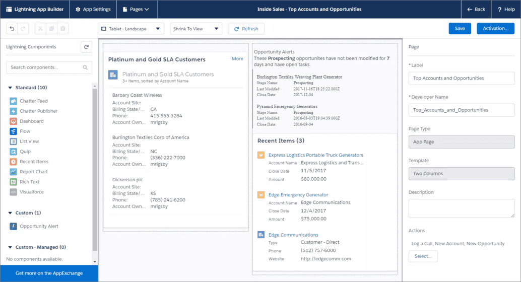 Lightning App Builder is that one door in Salesforce to a completely customized experience. It comes with a drag-and-drop feature that makes it very simple to create pages by picking components from the component library.According to Salesforce, the component library contains over 300 components, all of which can be quickly integrated with Salesforce. Similarly, specific needs can be met by browsing the AppExchange containing over 500 apps at present.