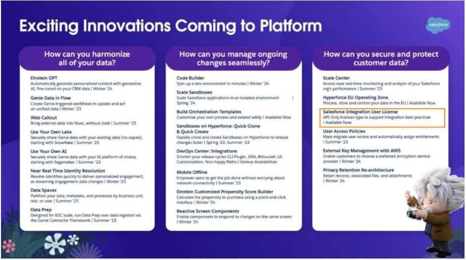 To address these challenges and streamline the integration process, Salesforce has introduced a new feature in its latest release: the 5x Free Integration User Licenses. This feature simplifies integration tasks and reduces costs by permitting organizations to establish up to five dedicated users exclusively for integration purposes, without incurring additional expenses. These designated users gain access to Salesforce’s API, facilitating the seamless exchange of data between Salesforce and other applications, while simultaneously preventing entry to the Salesforce user interface and any additional functionalities.