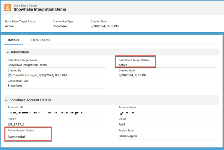 You can verify that your data share target was connected successfully by checking that your status is showing as “Active,” and that your authentication status is showing “Successful.”