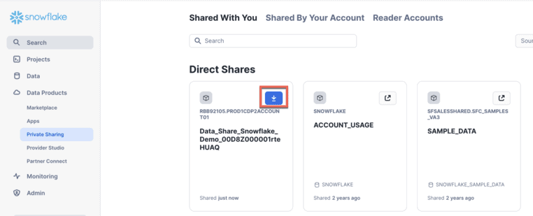 In Snowflake, navigate to Data Products, then Private Sharing. Under Direct Shares, you’ll see the data share from Salesforce Data Cloud. Click the down arrow button to get the data.