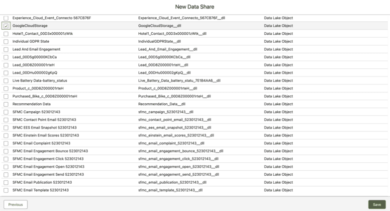 Next, choose a data lake object or data model object to share. In this case, you’ll choose to share a data lake object that is ingesting data from Google Cloud Storage. Finally, click Save.