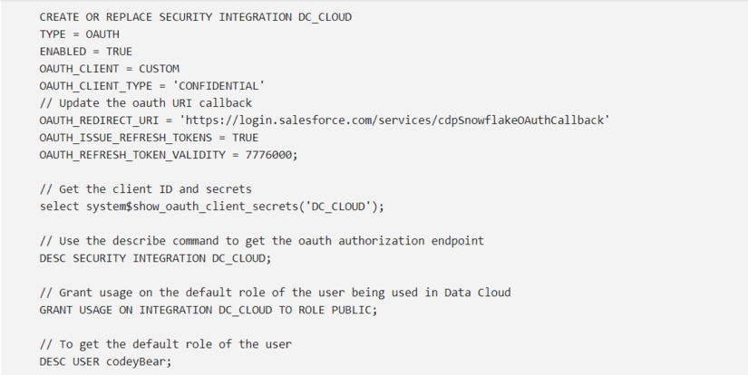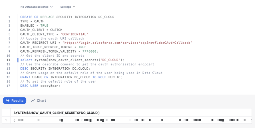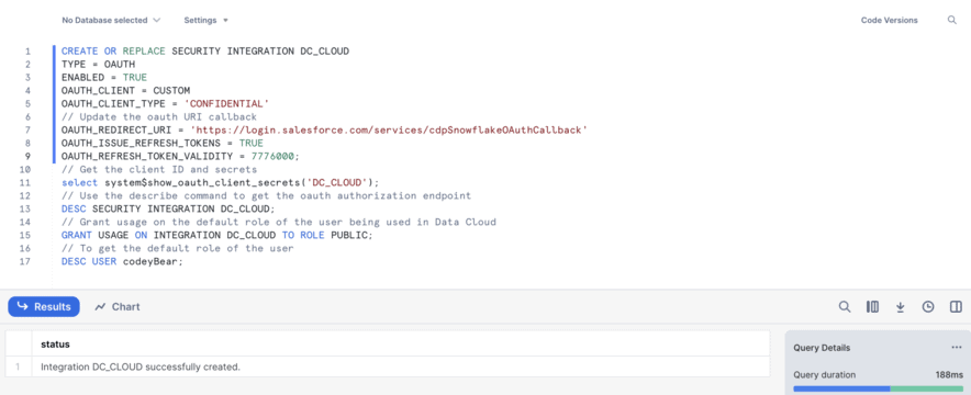 Then, run lines 1-9 to create the security integration by pressing command + return on a Mac or ctrl + enter on a Windows machine.