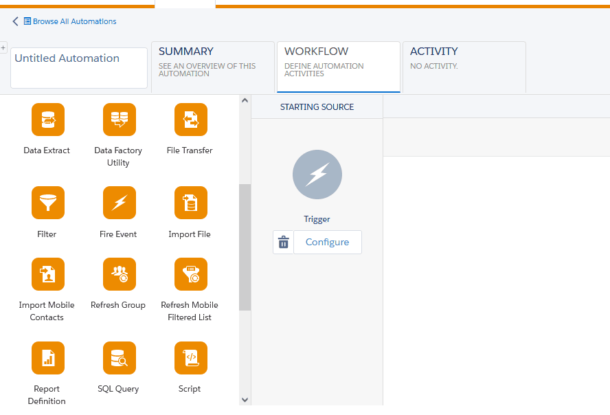 Automation Studio in Salesforce Marketing Cloud is a powerful tool. An application used to execute marketing and data management activities. Also, it works on an immediate, triggered, or scheduled basis and makes sending emails, queries, imports, and more happen automatically exactly when you expect and need them.