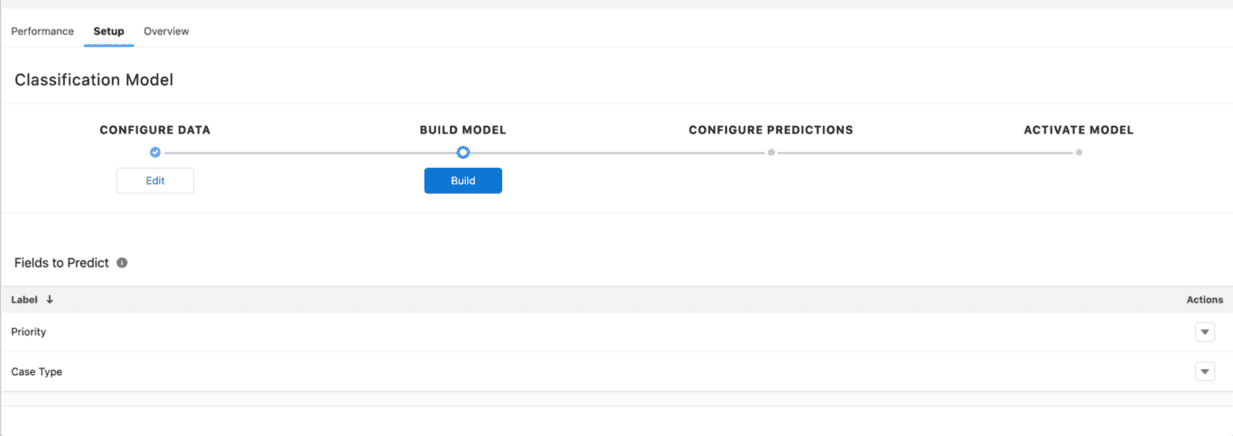 Click Finish, and then select the model name on the Einstein Classification Setup screen. In the Setup tab, use the Action menu to delete fields or the Configure Data dropdown to add new fields. After this, click Build to initiate model creation. Salesforce will notify you via email once the model is built.